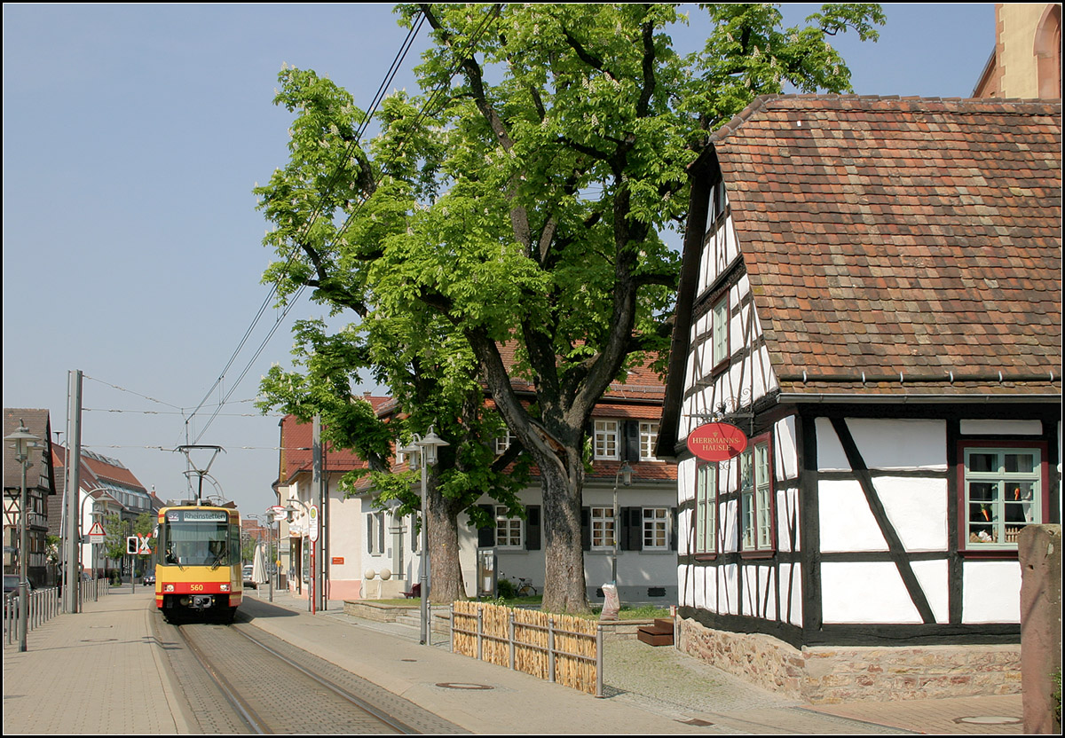 Mit der Stadtbahnlinie S2 mitten durch Stutensee-Blankenloch. Eine wunderschön eingefügte Bahntrasse in ein schönes Dorf.