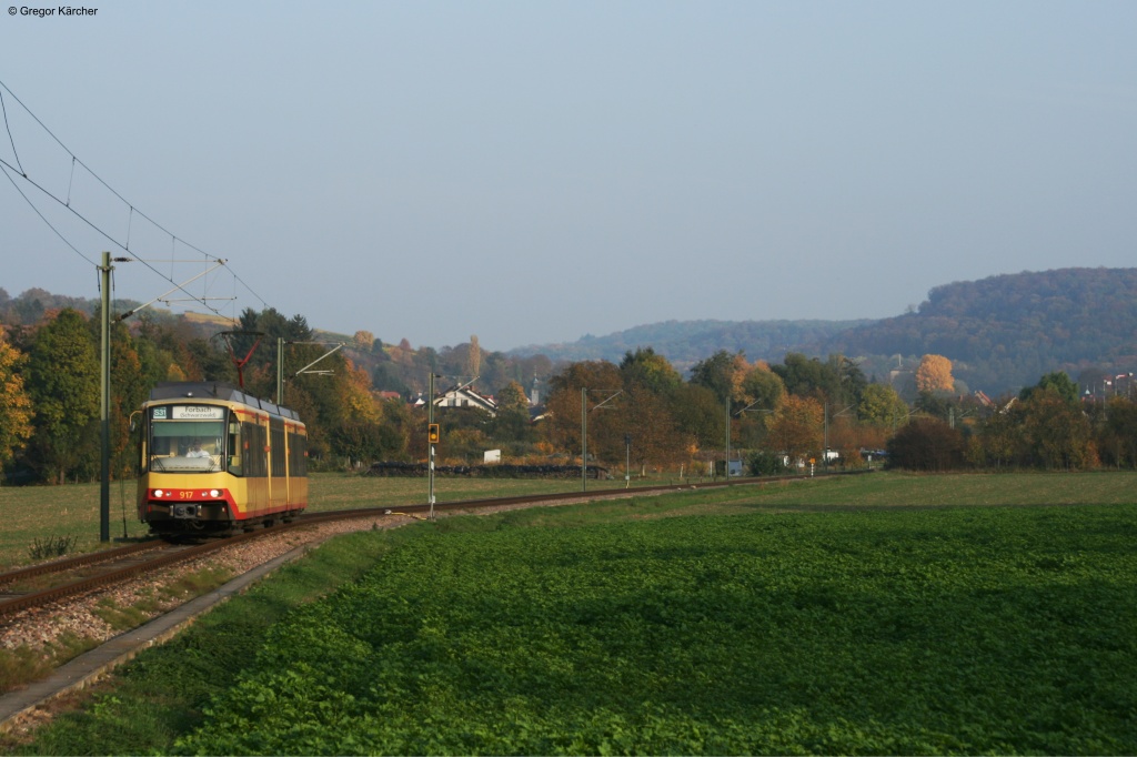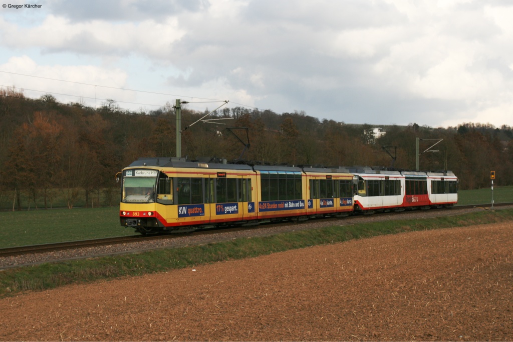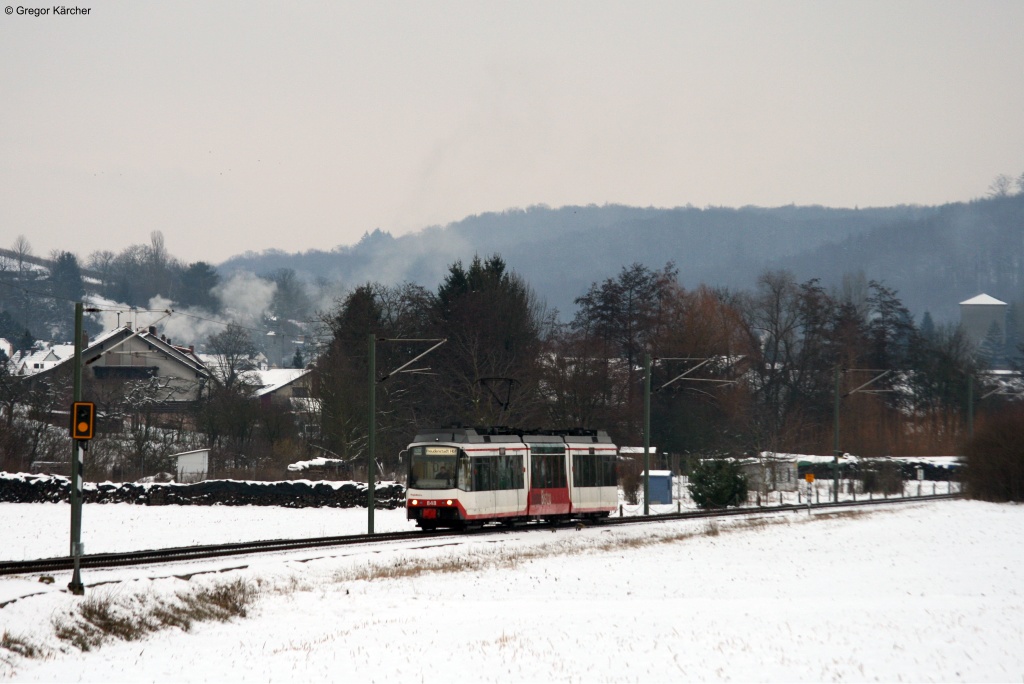 AVG ETW 812 "Europabad Karlsruhe" hat den Bahnhof Stettfeld verlassen und fährt weiter nach Odenheim. Der nächste Halt ist in Kürze Zeutern Sportplatz. Aufgenommen am 21.01.2013. Gregor Kaercher