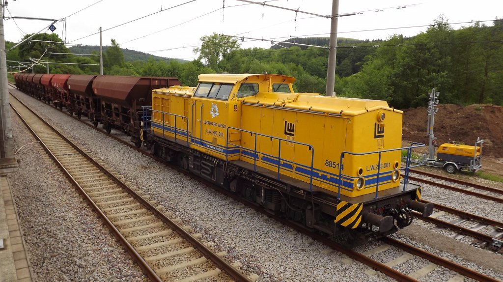 Da aufgrund von Gleisbauarbeiten momentan der Zugverkehr auf der Albtalbahn ruht ist ein Schienenersatzverkehr eingerichtet. Unter anderem wird neben diversen kleinen Arbeiten auch der komplette Oberbau zwischen den Bahnhöfen Etenrot (RETZ) und Fischweier (RFIW) erneuert. Es muss aber der neue Schotter an die Baustelle gebracht werden, sodass die Firma Leonhard Weiss diese Garnitur aus DB-Schotterwagen und einer V 203 einsetzt. So gesehn am 22.05.2013 auf den Gütergleise im Bahnhof Busenbach (RBUS). Rick Eichner