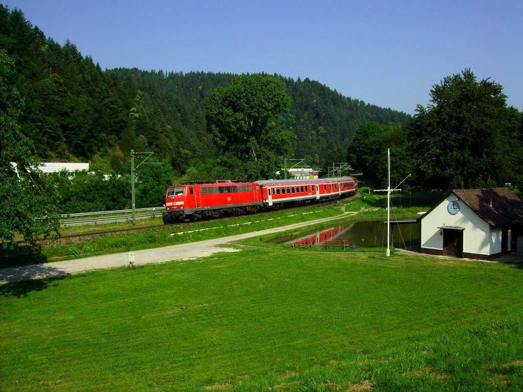 RE 38959 (Murgtäler Radexpress), welcher am 07.07.2013 bei Kaiserwetter mit 111 069-1 (Bh Ludwigshafen) bespannt war, legte sich am Eisweiher in Scheuern in die Kurve. Die vorbildlich herausgeputzte Garnitur ist eine willkommene Abwechslung im sonst sehr eintönigen Murgtal. Rick Eichner