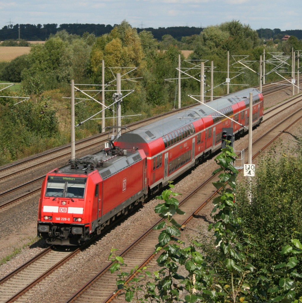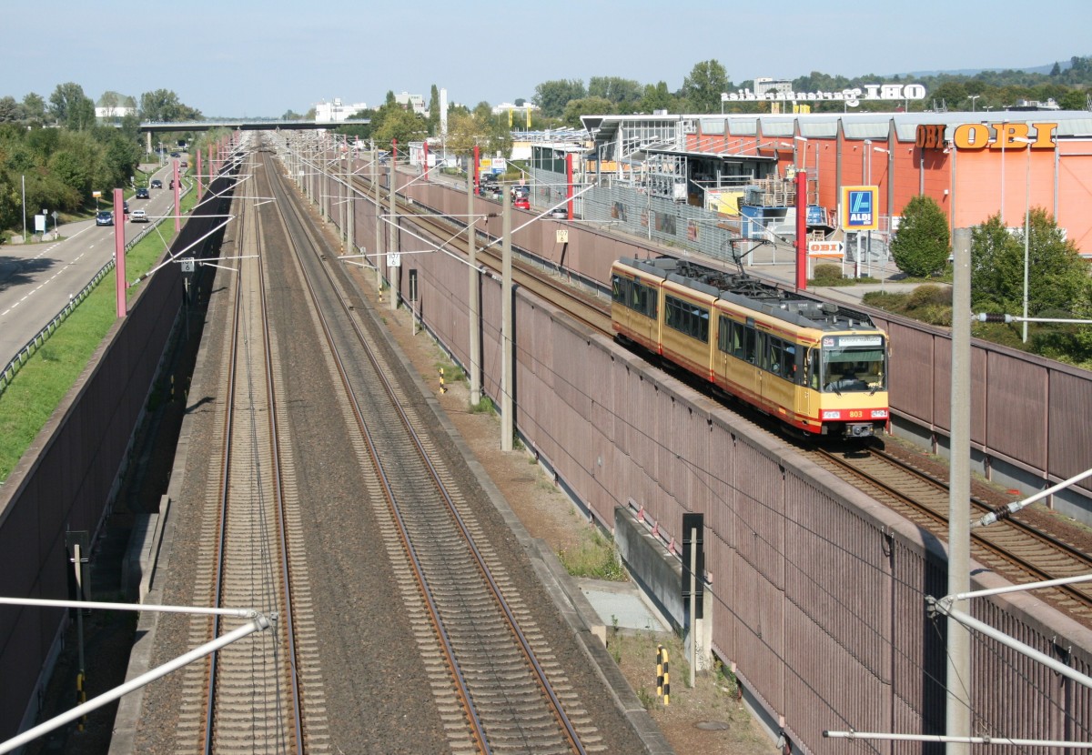 Eine der hässlichsten Bahnstrecken Deutschlands: Eingezwängt zwischen Lärmschutzwänden, Baumarkt und Straße ist AVG-ET 803 als S 85717 (Achern–Karlsruhe Marktplatz) auf der Rheintalbahn zwischen Sinzheim und Baden-Baden unterwegs.