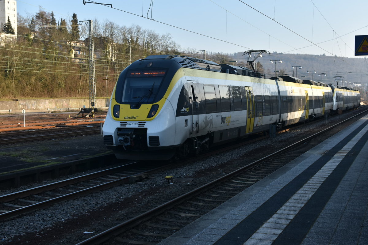 Ausfahrt eines RE 10a aus Neckarelz der vom Abellio 8442 603 geführt wird, als Doppeleinheit mit dem 8442 105 geht es nach Mannheim Hbf am 21.1.2020 Andreas Strobel
