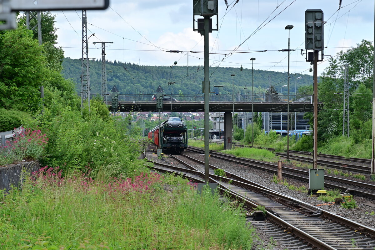 Seit dem letzten Unwetter das die Mitte sprich NRW und Niedersachsen unseres Landes traf ist in Mosbach-Neckarelz ein Mercedes-Autozug beladen abgestellt in Gleis4, einige Tage hing noch eine Lok am Zug, doch die wurde nach zwei Tagen abgezogen und so blieben die beladenen Wagons in Mosbach. Überigens, heutemorgen stand der Zug immernoch unverändert in Neckarelz.