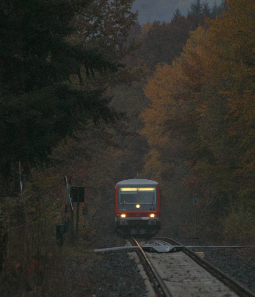 Aus dem dunklen Wald kommt 628 267-7 von Miltenberg nach Seckach, an einem sehr veregneten Nachmittag, in den Bahnhof von Rippberg gefahren. 02.11.2009 Christian Kühn