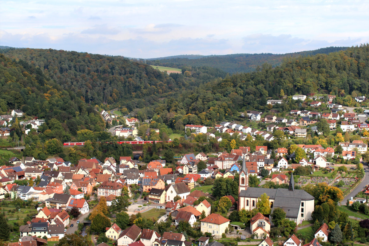 Blick von der Minneburg auf Neckargerach am 29.09.2017. Gut zu erkennen ist die Streckenführung der Neckartalbahn, welche auf einem Damm den Ort durchfährt. David Endlich
