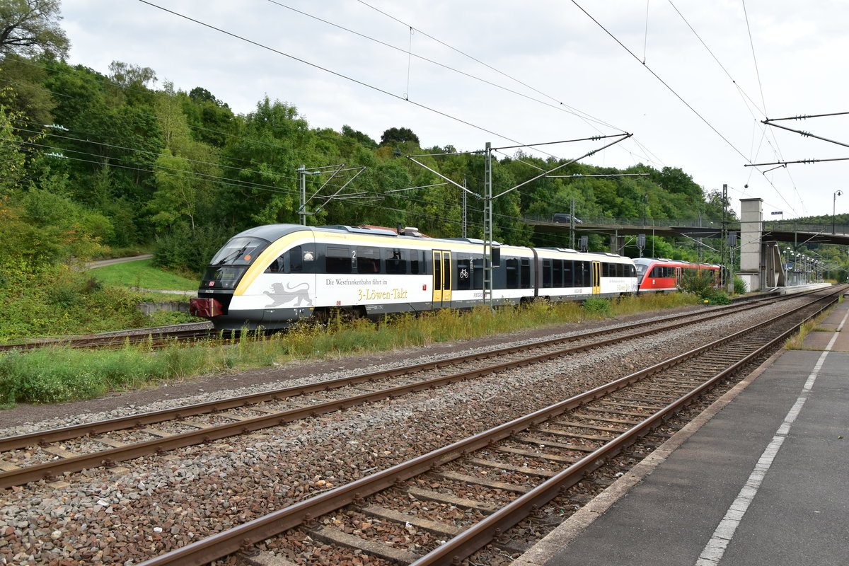 Ausfahrt aus Seckach haben die beiden Triebwagen 642 006 und 642 060 als Regionalbahn nach Walldürn. An Samstag den 2.9.2017 gegen 16:45 auf der Kbs 784 Madonnenlandbahn. Andreas Strobel