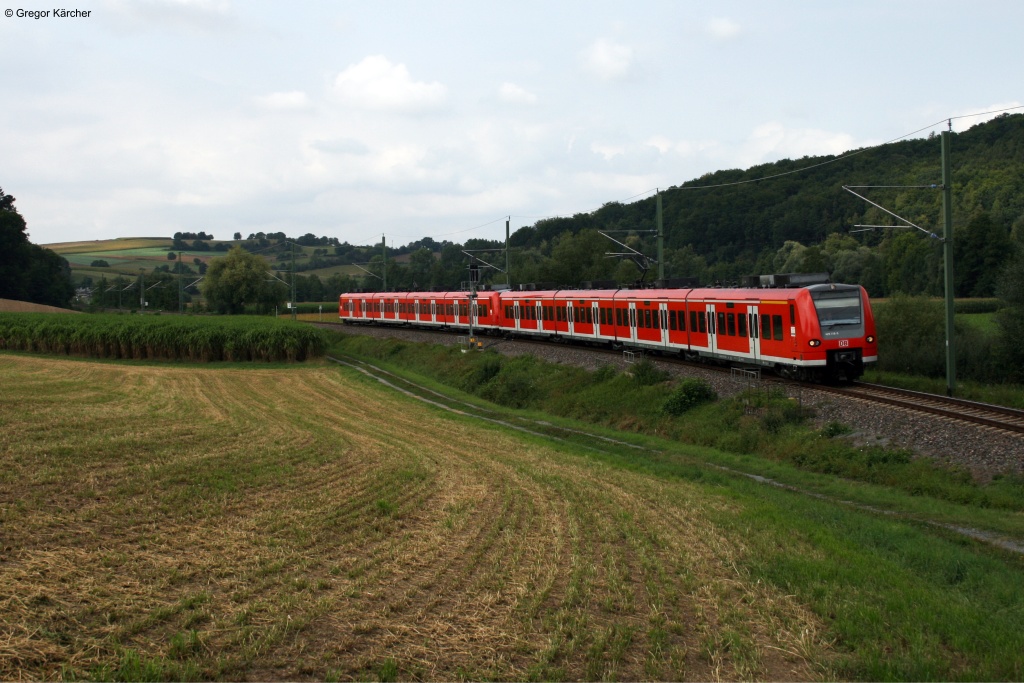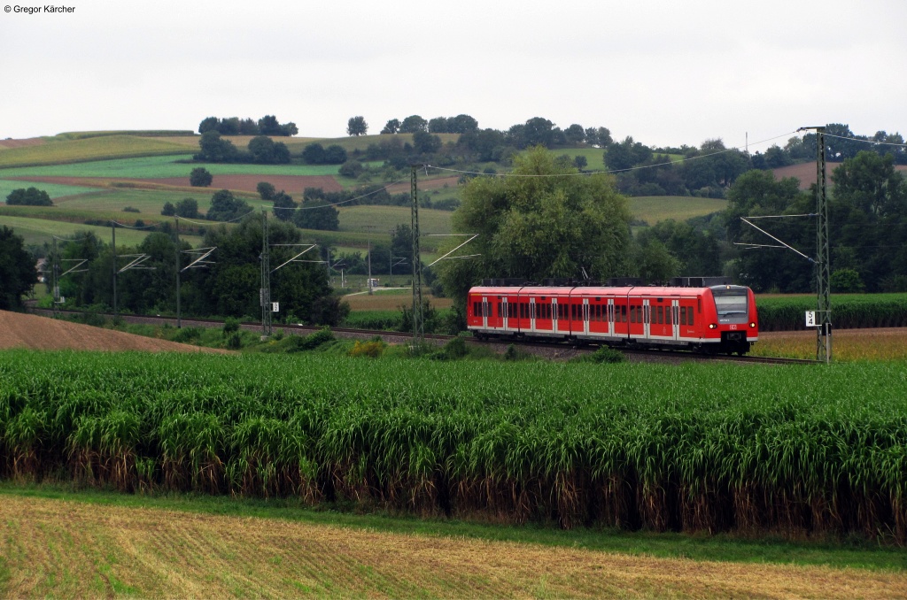 425 115 + 425 *** als S5 nach Sinsheim kurz vor Hoffenheim. Das Geländer links neben dem Zug ist das alte Signalfundament, an dem früher noch das alte Einfahrhauptsignal (Flügelsignal) von Hoffenheim stand. Aufgenommen am 01.09.2012. Gregor Kaercher