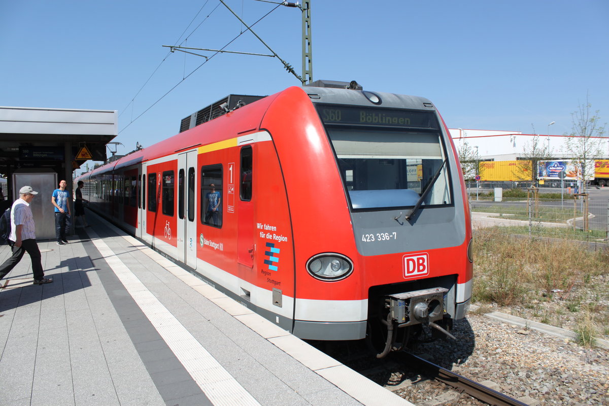 Am 07.08.2015 steht 423 336 als S60 nach Böblingen im Bahnhof Renningen.