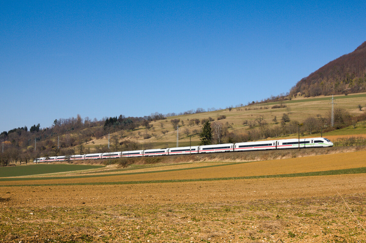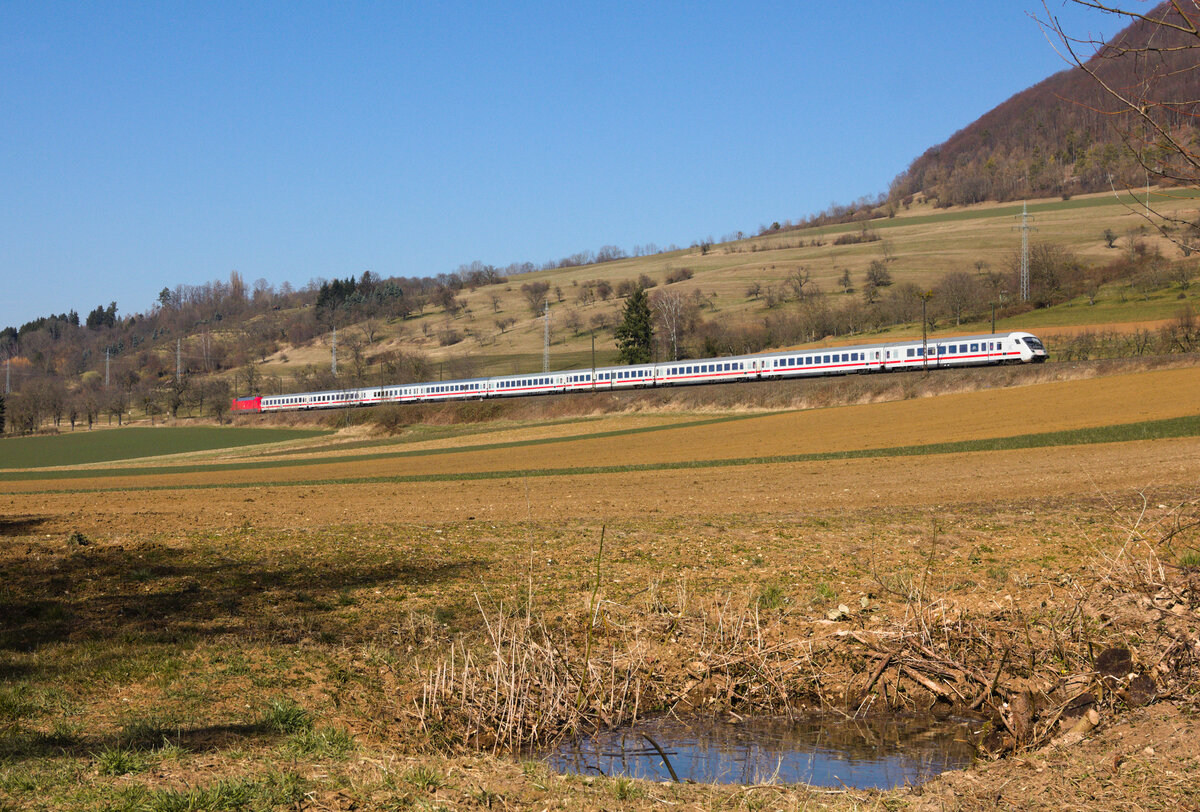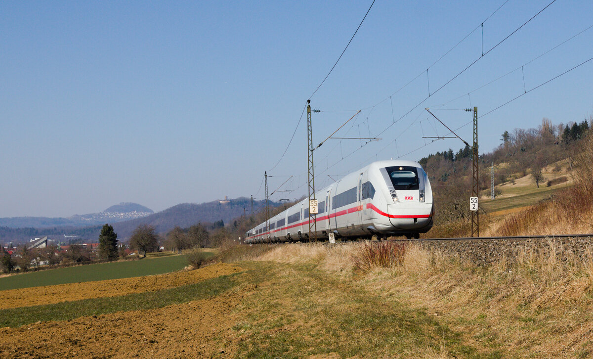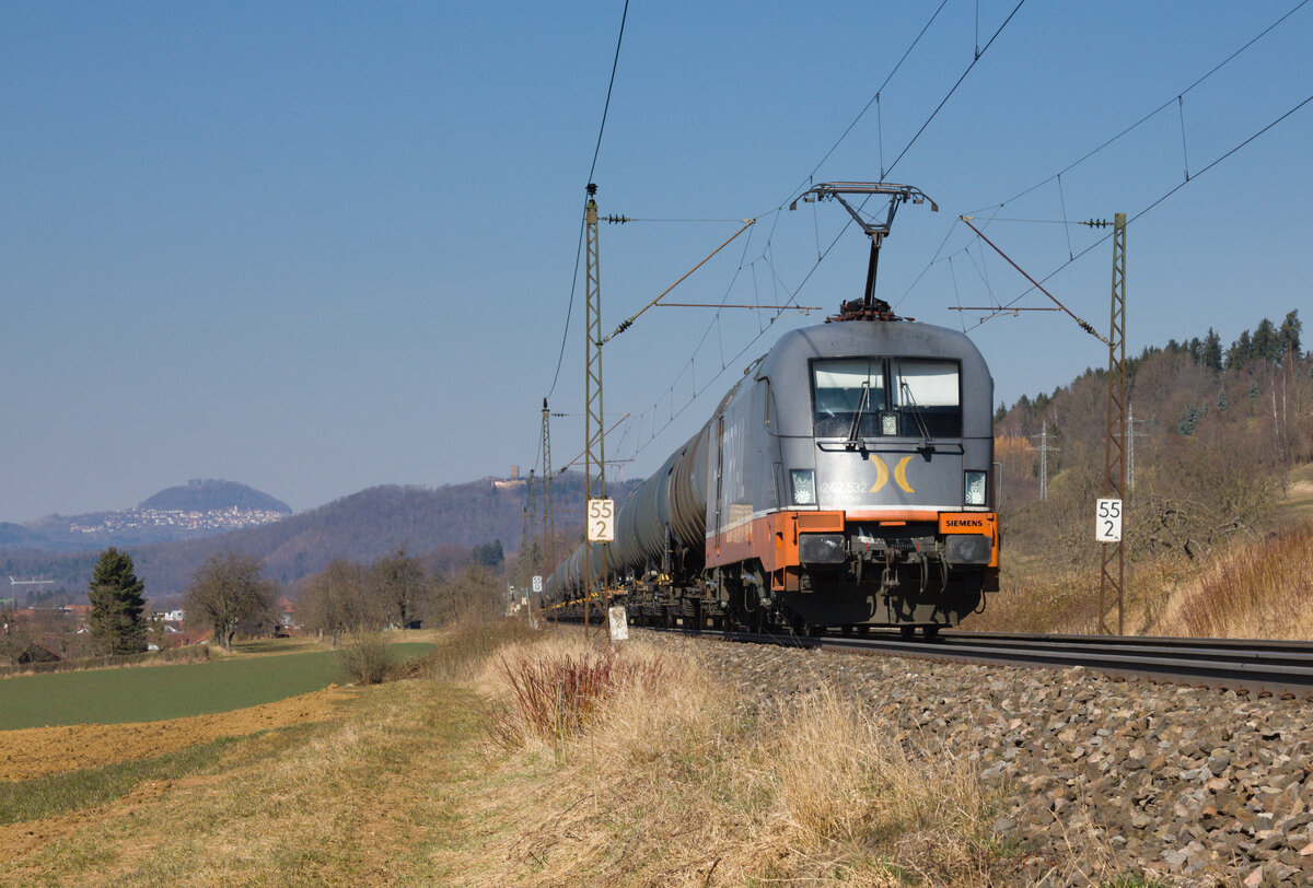 Et 5.02 A als MEX 16 Stuttgart-Ulm am 11.03.2022 bei Kuchen. Im Hintergrund ist links der Rechberg (708,1 m ü. NHN) zu sehen, daneben die Burg Staufeneck. Fluffy