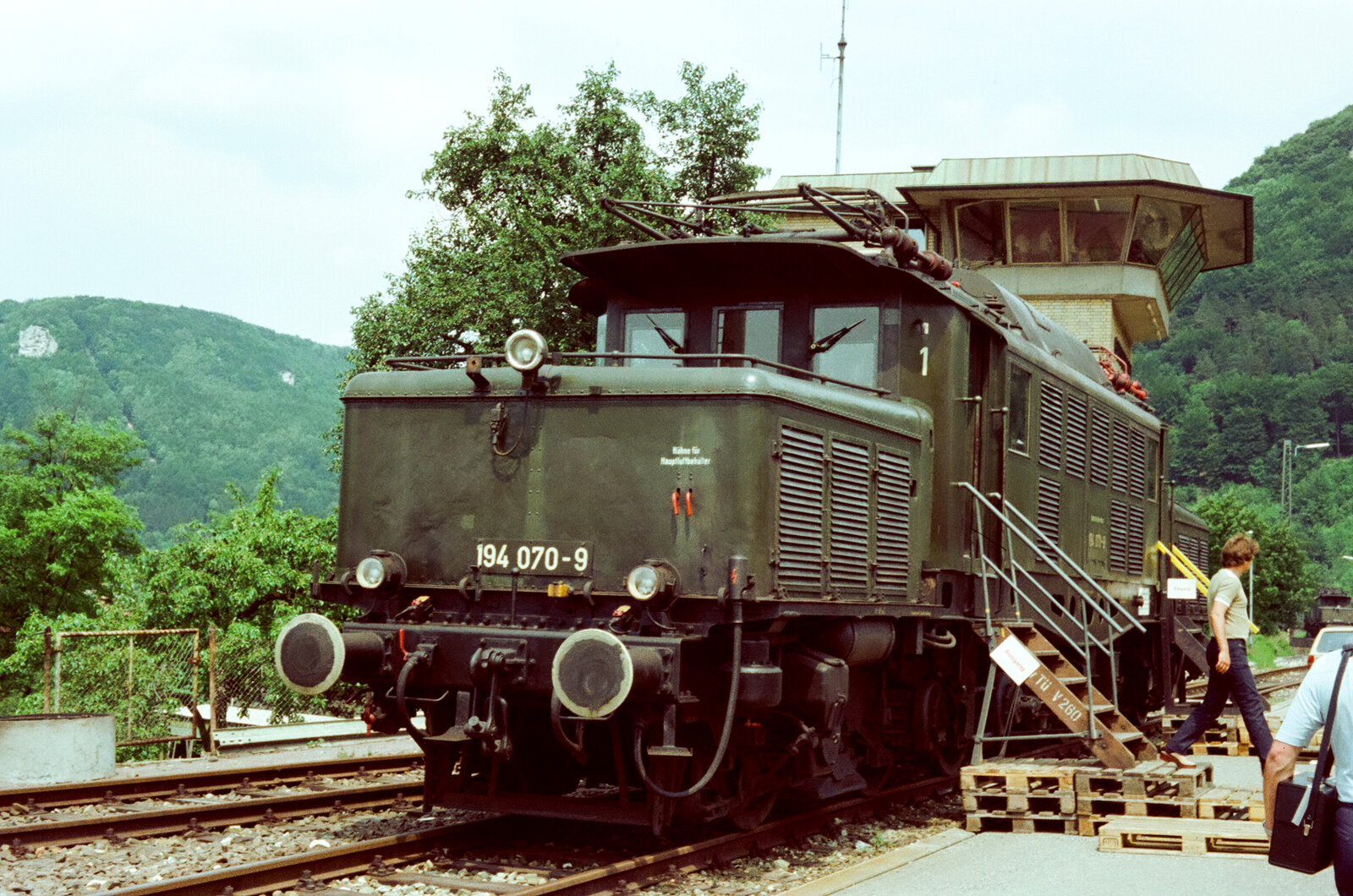 Ellok 193 008-0 (DB) bei einer Lokausstellung (26.06.1983) vor dem Bahnhof Geislingen Steige. Lokomotiven der DB-Baureihe 193 waren als Schiebelokomotiven noch recht lange auf der Geislinger Steige eingesetzt. Frank Nowotny