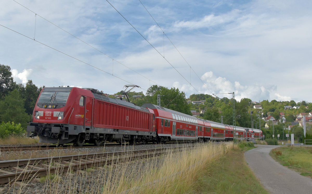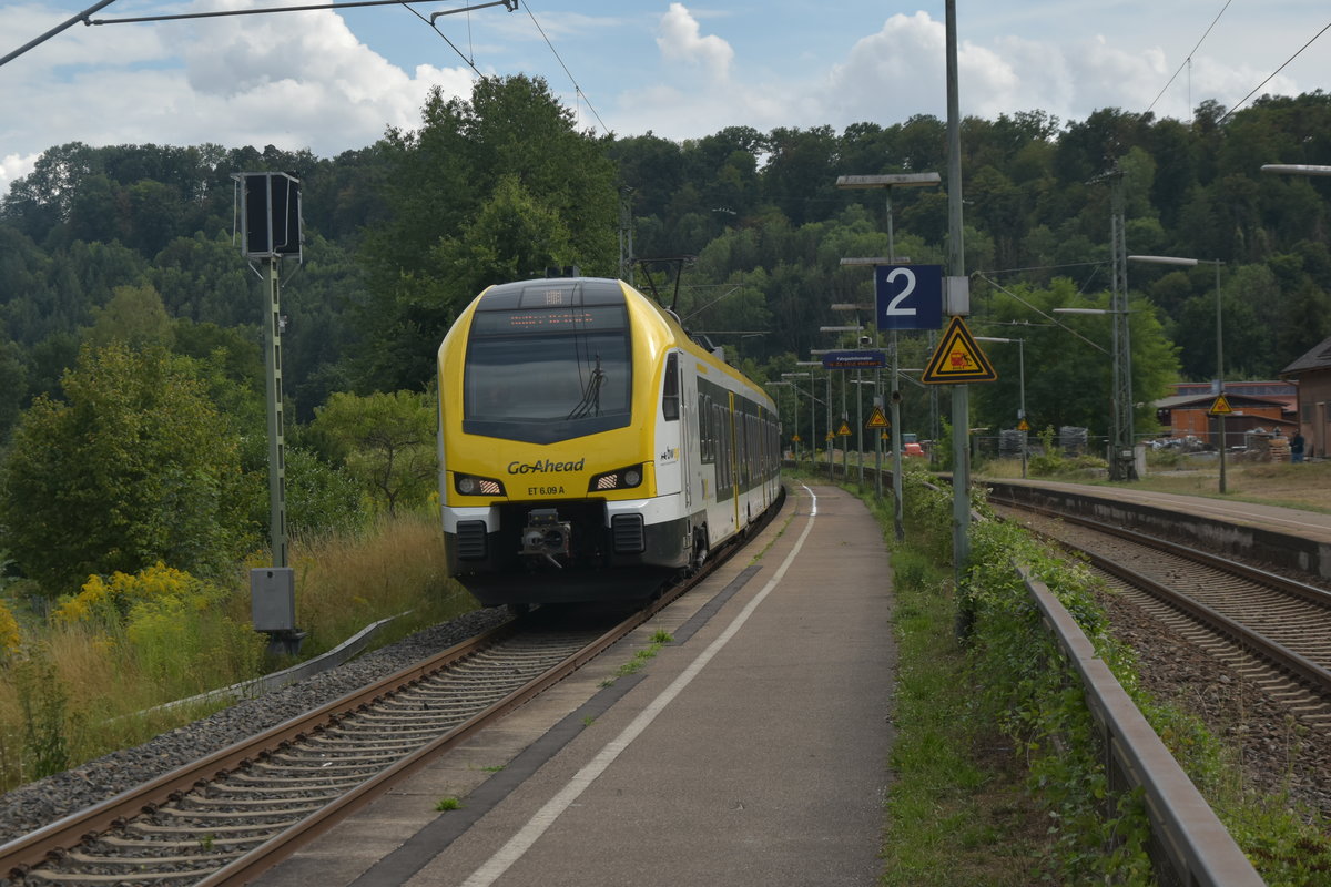 Am Samstagabend ist ein RE8 durch Roigheim gefahren in Richtung Osterburken seinem nächsten Halt, der GoAhead Triebwagen ET 6.04 und 4.03 hier im Nachschuß zusehen sind nach Würzburg Hbf unterwegs.6.8.2022 Andreas Strobel