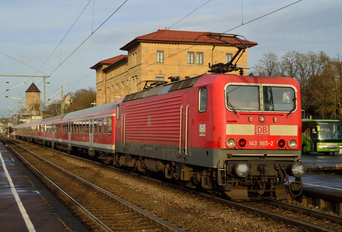 Auf Gleis 1 des Bahnhofs Neckarsulm ist soeben eine RB nach Würzburg eingefahren, Steuerwagenvoraus schiebt die 143 965-2 den aus N-Wagen bestehenden Zug. 3.1.2014 Andreas Strobel