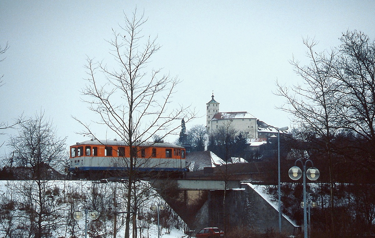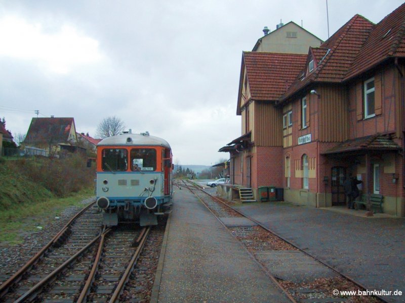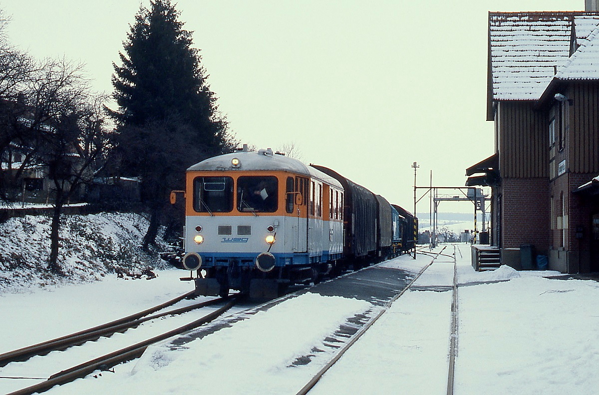 Vor dem ehemaligen Empfangsgebäude von Vaihingen (Enz) Nord wartet der T 04 der WEG im Februar 1992 auf Fahrgäste nach Enzweihingen. Die WEG kaufte den Triebwagen 1954 von der DB (dort VT 70 901). Horst Lüdicke