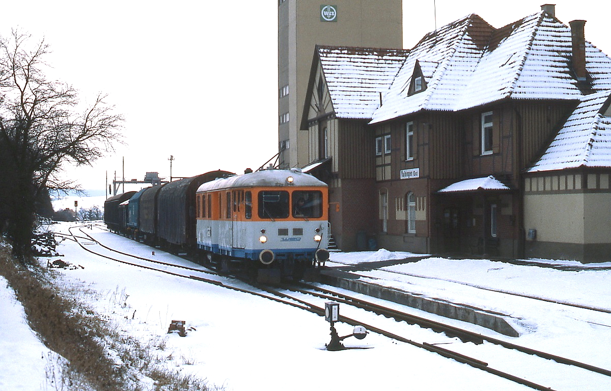 Mit einer beachtlichen Anzahl Güterwagen im Schlepp wartet der T 04 im Februar 1992 im Bahnhof Vaihingen (Enz) auf die Weiterfahrt nach Vaihingen (Enz) Nord Horst Lüdicke