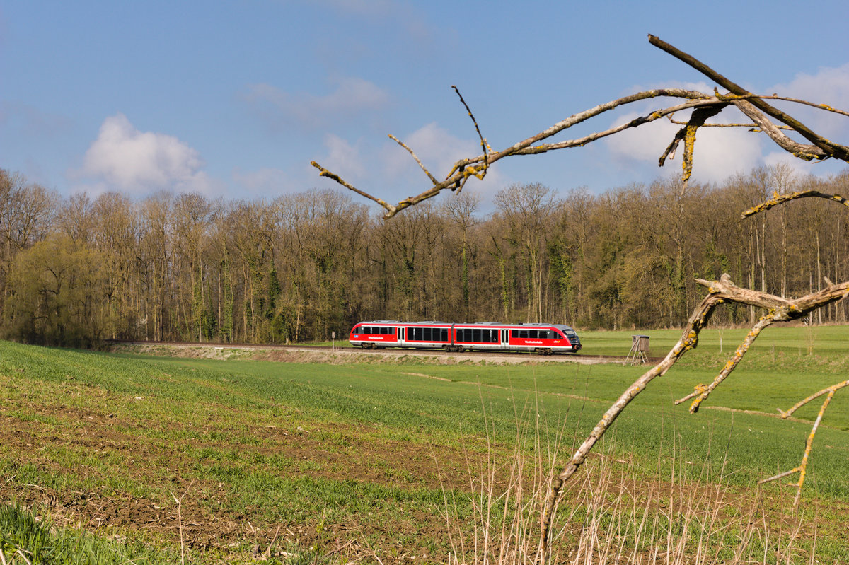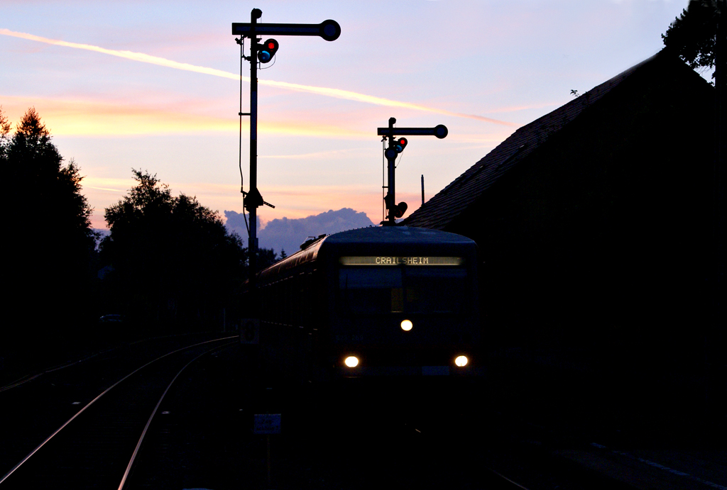Blick nach Osten auf eine der stündlichen Zugkreuzung in Schrozberg am 20.8.14: Links 628 241 als RB nach Würzburg auf Gleis 2 und rechts 642 127 als RB nach Crailsheim auf Gleis 1.