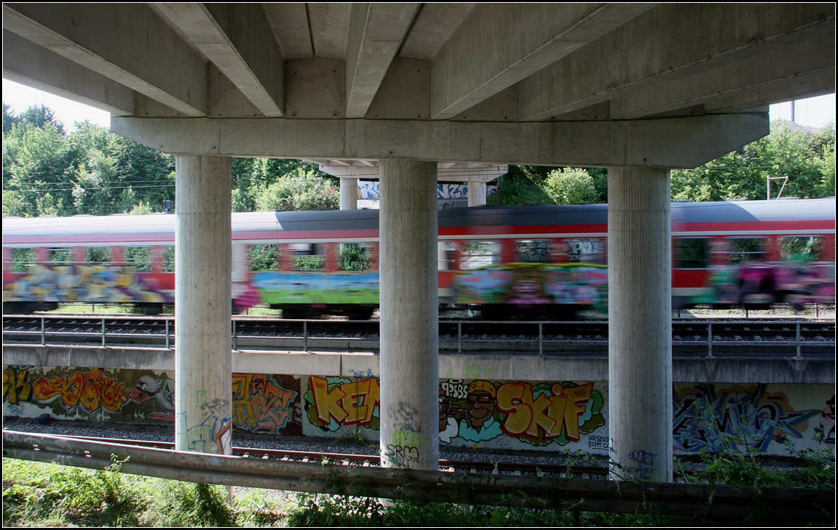Passend zum Graffiti der Betonwände tragen auch einige Wagen eines Regional-Expresszuges in Richtung Schwäbisch Hall-Hessenthal diese Bemalung. Eigentlich bin ich kein Freund von Graffiti, aber es kann durchaus auch fotografische Reize entwickeln.