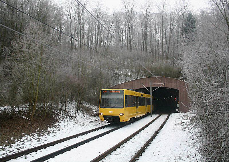 Der Tunnel Botnanger Sattel, eröffnet 1994, unterquert einen Höhenzug zwischen dem Stuttgarter Westen und dem Stadtteil Botnang. Hier die Tunnelausfahrt auf Botnanger Seite an der Haltestelle Lindpaintnerstraße.