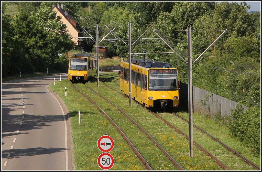Zwei Stadtbahnen der Linie U14 begegenen sich am nördlichen-östlichen Rand von Stuttgar-Mühlhausen auf der seit 1999 bestehenden Verlängerungsstrecke nach Remseck.