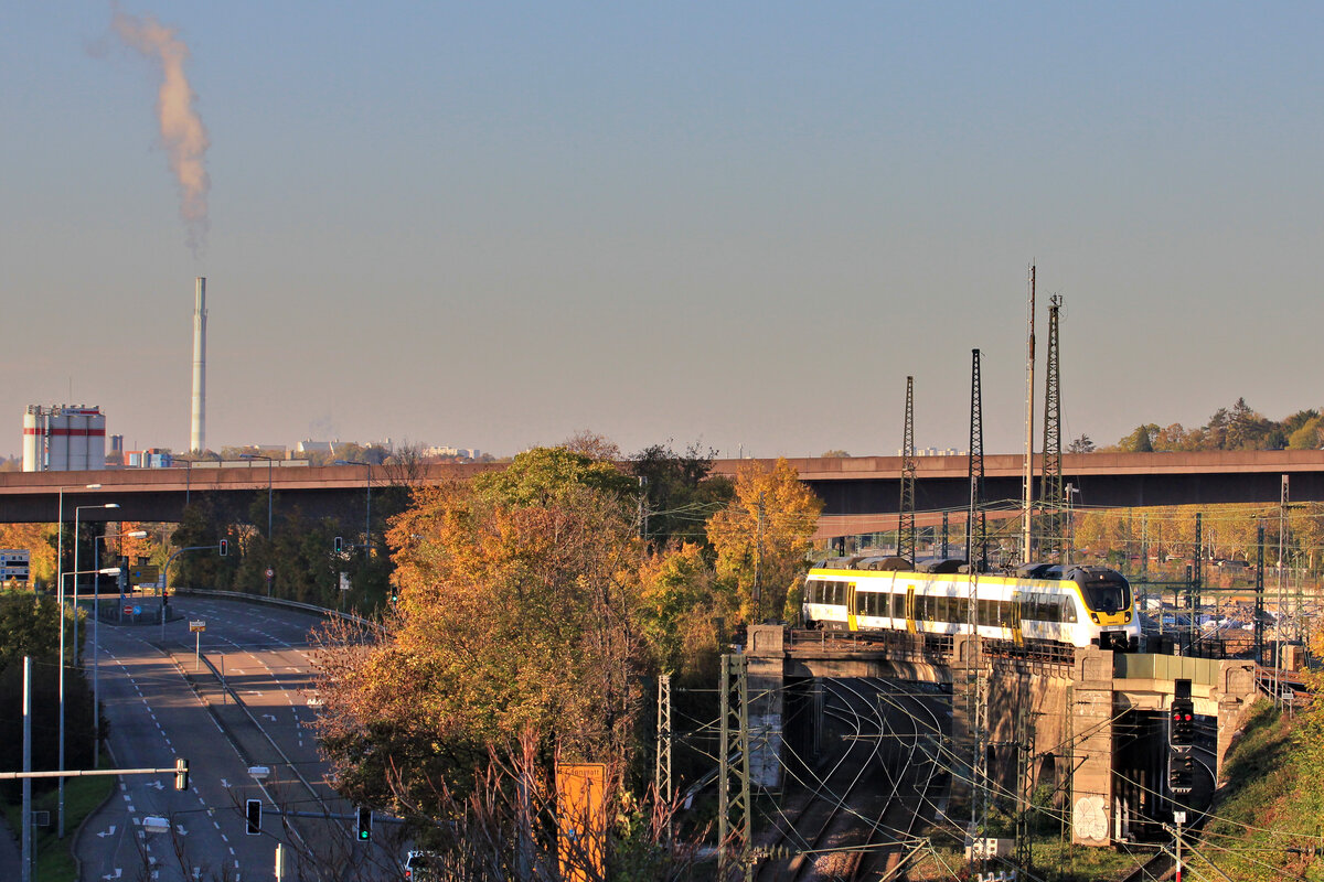 Von 430 089 angeführter Langzug als S1 Kirchheim-Herrenberg am 06.08.2022 am Eszetsteg in Stuttgart.
