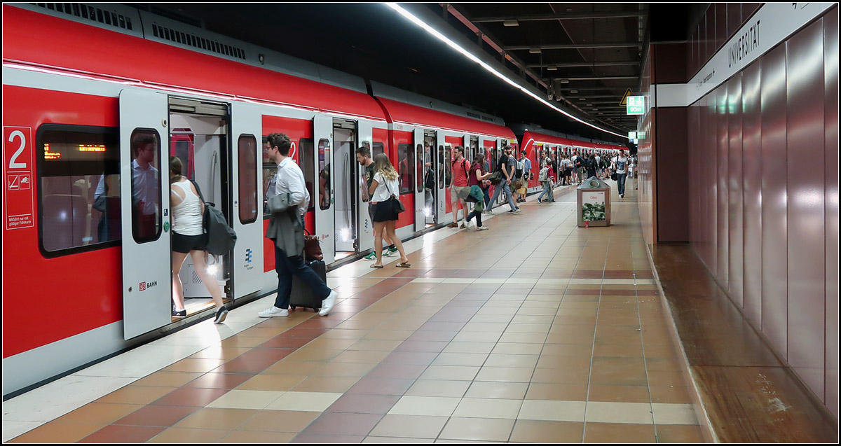 Halt eines S-Bahnzuges in der tief unter der Erde Station Universität im Uni-Campus Stuttgart-Vaihingen. Auch hier wurden die ursprüngliche Deckenverkleidung entfernt.