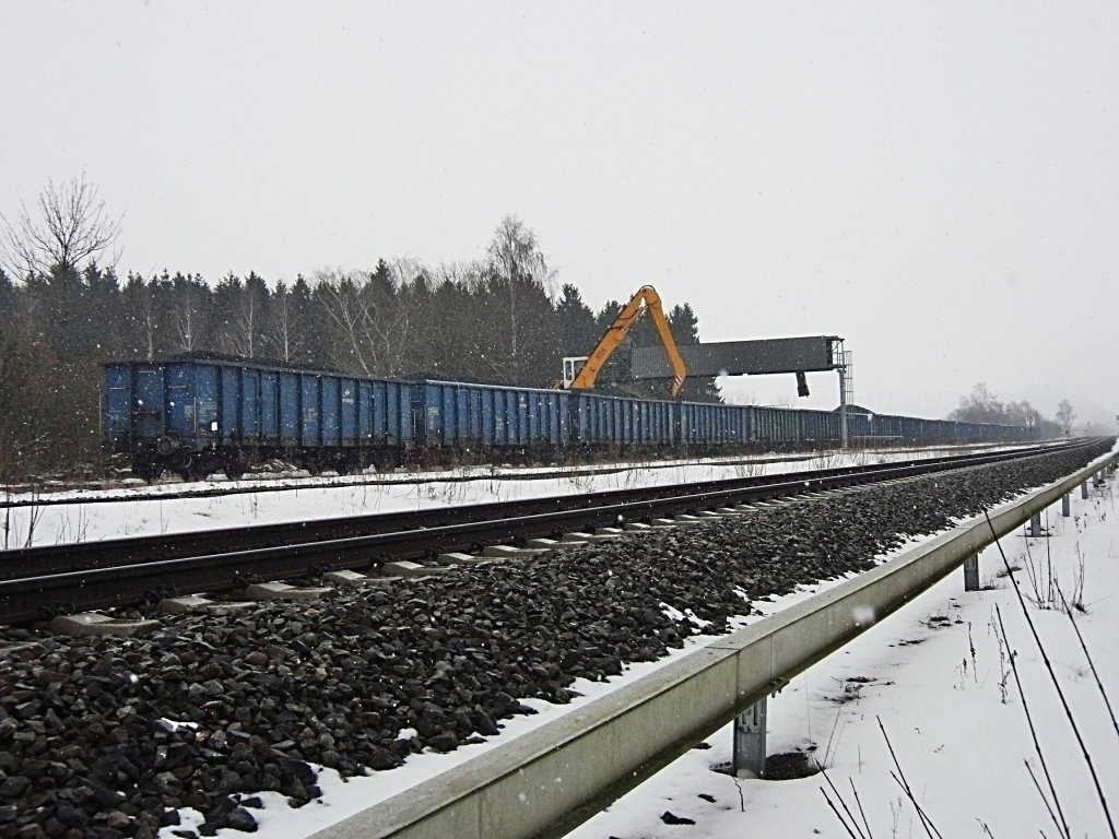 Entladung der mit Kohle beladenen Wagen der PKP cargo, die von einer G 1206, der 5009 der akiem nach Langenschemmern gebracht wurden (15.02.2013). Jürgen Vos