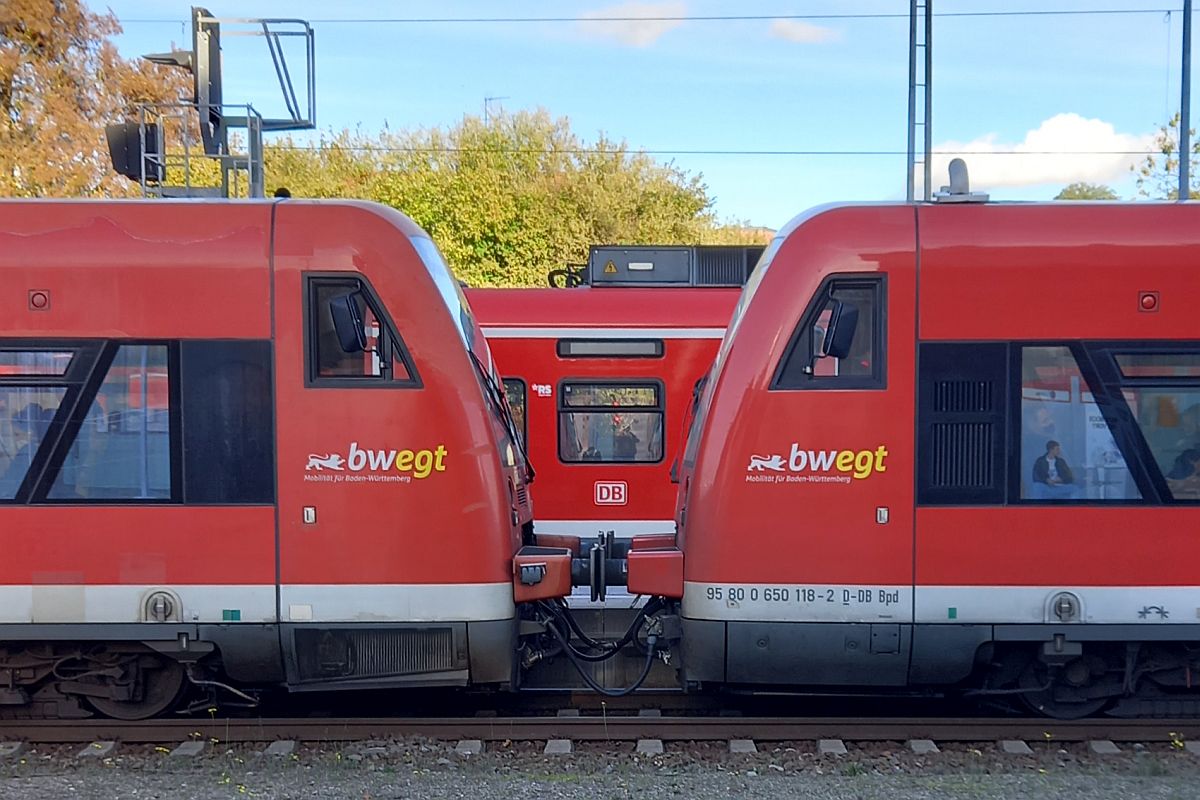 Auch nach der Elektrifizierung der Südbahn zwischen Ulm und Friedrichshafen sind Einsätze von Dieseltriebwagen der Baureihe 650 im Regionalverkehr aktuell öfters zu beobachten. Der Blick zwischen den beiden Dieseltriebwagen auf einen dahinterstehenden Elektrotriebwagen der Baureihe 425 inspirierte den auf einen Zug wartendenden Bahnpendler, diesen Augenblick festzuhalten. Biberach (Riß), 25.10.2022 Jürgen Vos