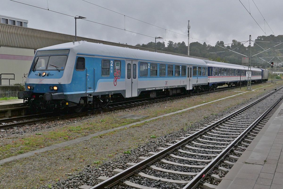 Ersatzverkehr für DB Regio Baden-Württemberg (|) - RB RS21 17347 von Ulm nach Biberach (Riß) Süd mit Steuerwagen D-GfF 50 80 80-34 101-1 Bnrbdzf und zwei Wagen der Gattung Bduu 497.2 von D-TRAIN, geschoben von 143 173-3 der Weser Ems Eisenbahn (WEE), bei der Einfahrt in den Bahnhof von Biberach (Riß) am 28.09.2022 Jürgen Vos