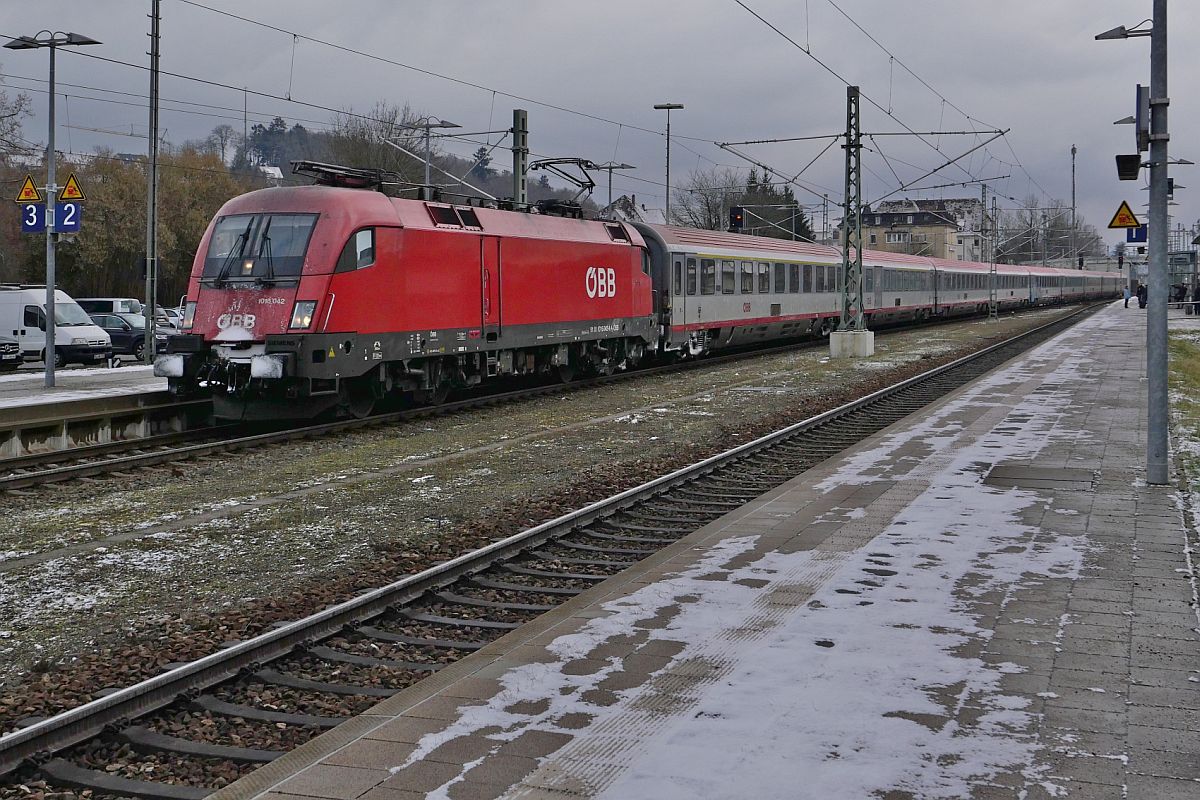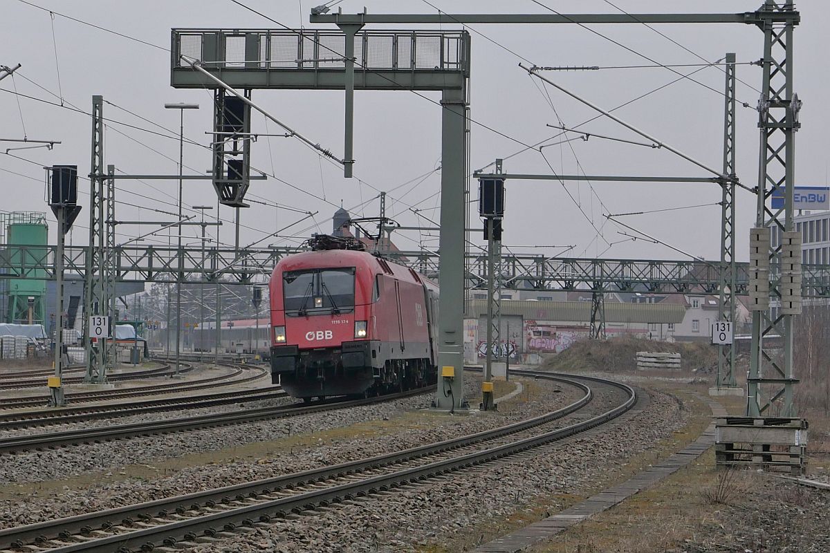 1016 024-2 mit den Wagen des IC 118 "BODENSEE", Innsbruck - Bochum, in den am 17.03.2022 ein "nightjet"-Wagen eingereiht ist, zwischen der Haltestelle Biberach (Riß) Süd und dem Bahnhof Biberach (Riß) Jürgen Vos