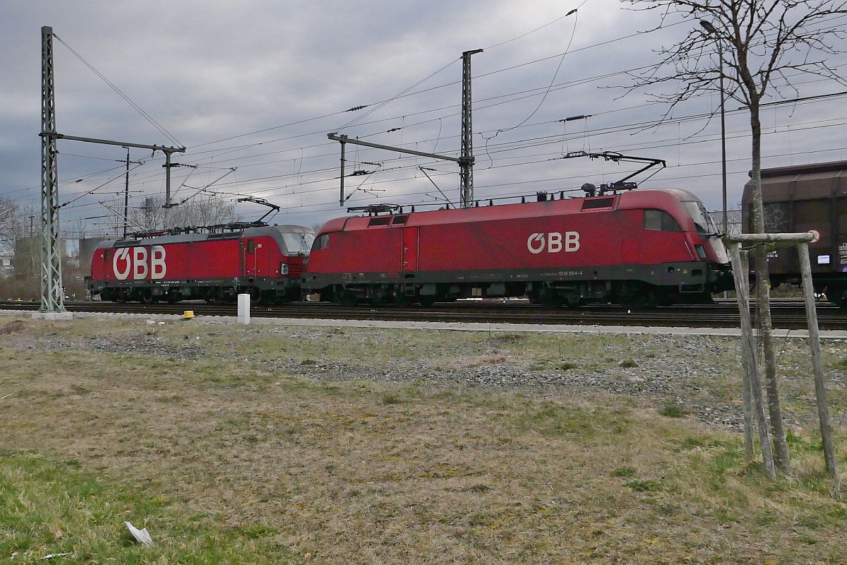 ÖBB-Loks in Biberach (Riß) (||) - Nach einem kurzen Halt in Biberach (Riß) ziehen 1293 002 und 1016 004 den Ganzzug mit 39 Schiebewandwagen am 23.03.2023 Richtung Ulm Jürgen Vos