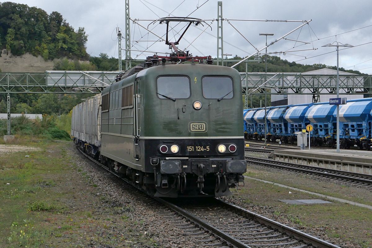 Überraschung (|) - Da steht der Bahnpendler am Bahnsteig und wartet auf den Zug, der ihn in den Feierabend fahren soll und stattdessen durchfährt 151 124-5 von SRI mit einem Ganzzug aus Rungenwagen der Gattung Sggrrs den Bahnhof von Biberach (Riß) am 27.09.2022. Aufnahmestandort am Bahnsteigende von Gleis 1. Jürgen Vos