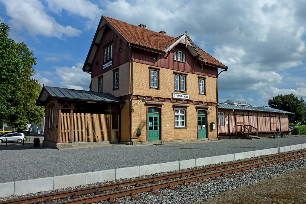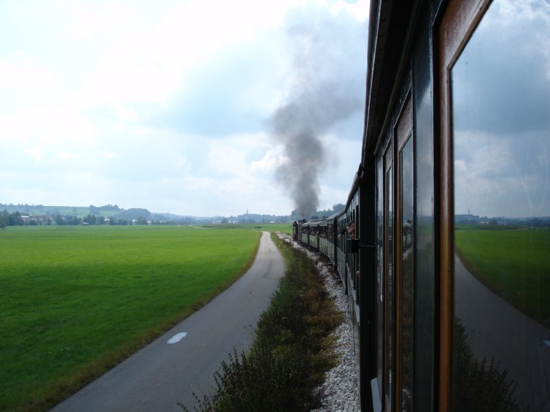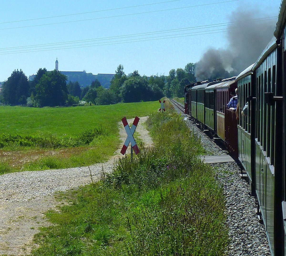 Öchsle-Museumseisenbahn, Blick aus dem fahrenden Zug auf den Endhaltepunkt Ochsenhausen mit der berühmten Abtei im Hintergrund, Aug.2012 rainer ullrich