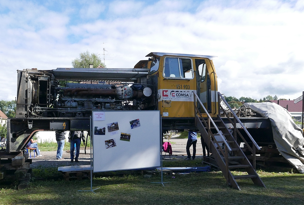Beim Bahnhofsfest der Öchsle Museumsschmalspurbahn am 10.09.2017 in Ochsenhausen war auch die zur Aufarbeitung teilzerlegte V51 903 zu sehen. Die 1964 bei Gmeinder in Mosbach hergestellte Lok war bis 1983 in DB-Eigentum, wurde auf der Bottwartalbahn eingesetzt und war von 1985 bis 2008 bei der spanischen Firma COMSA im Bauzugeinsatz. Jürgen Vos