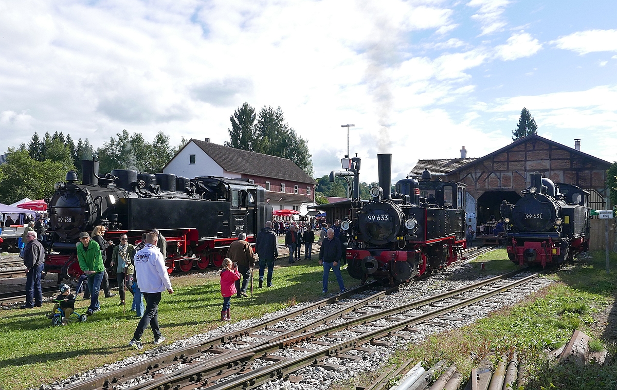 Dampflokparade beim Bahnhofsfest der Öchsle Museumsschmalspurbahn am 10.09.2017 in Ochsenhausen. 99 788, hergestellt von LKM in Babelsberg 1956, 99 633, hergestellt von der Maschinenfabrik Esslingen 1899 und 99 651, hergestellt von Henschel in Kassel 1918. Jürgen Vos