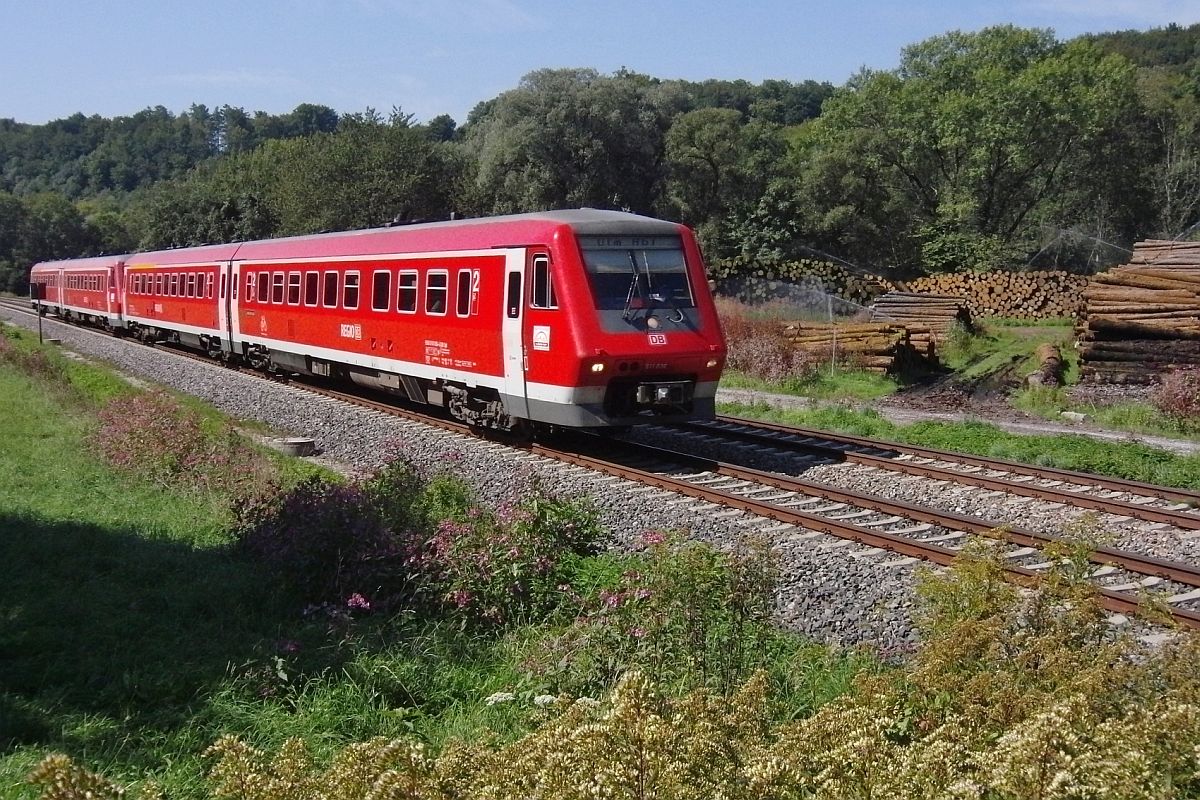 Auf der Fahrt von Basel nach Ulm passieren 611 035 und ein unerkannt gebliebener 611er als IRE 3365 am 16.09.2012 im Schussentobel bei Kilometer 165.4 einen Holzlagerplatz Jürgen Vos