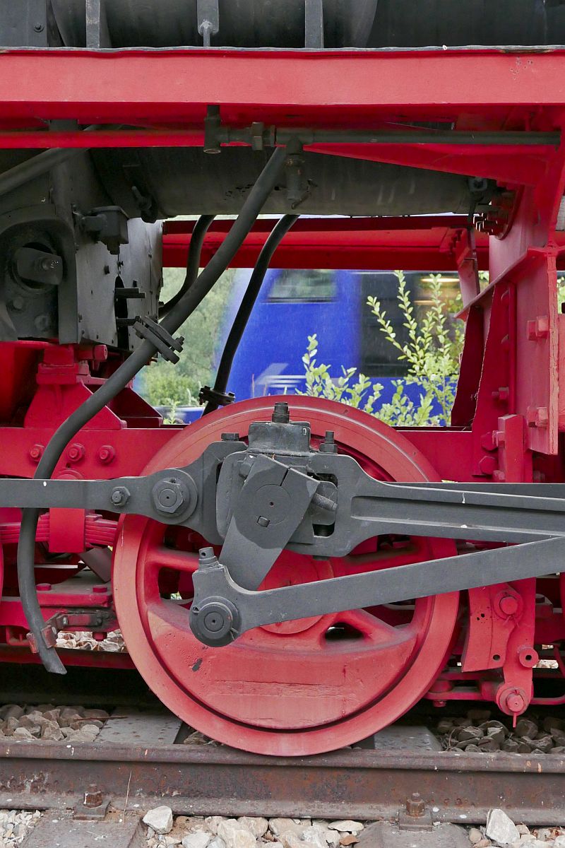 Blick durch das Fahrgestell der polnischen Schmalspur-Dampflok Px 48-1757 auf den hinteren Teil eines von zwei nach Aulendorf fahrenden Triebwagen der Bodensee-Oberschwaben-Bahn. Durlesbach, 03.08.2020 Jürgen Vos
