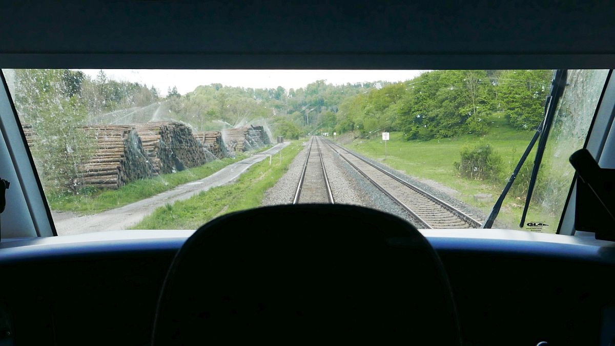 Da am 14.05.2019 der Blick durch die verschlossene Tür des Führerstand eines Triebwagens der Baureihe 612 nicht durch den Vorhang verdeckt war, wurde auf der Fahrt von Aulendorf nach Friedrichshafen als RE 22593 im Schussentobel bei Kilometer 165.4 auf den Auslöser gedrückt Jürgen Vos
