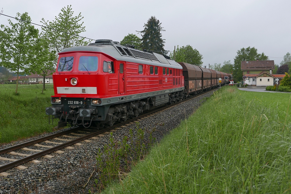 Von Friedrichshafen Gbf kommend befindet sich 232 618-9 mit dem "Roßberger Kieszug" am 17.05.2016 in Haslanden auf der Fahrt nach Roßberg zur Beladung. Jürgen Vos