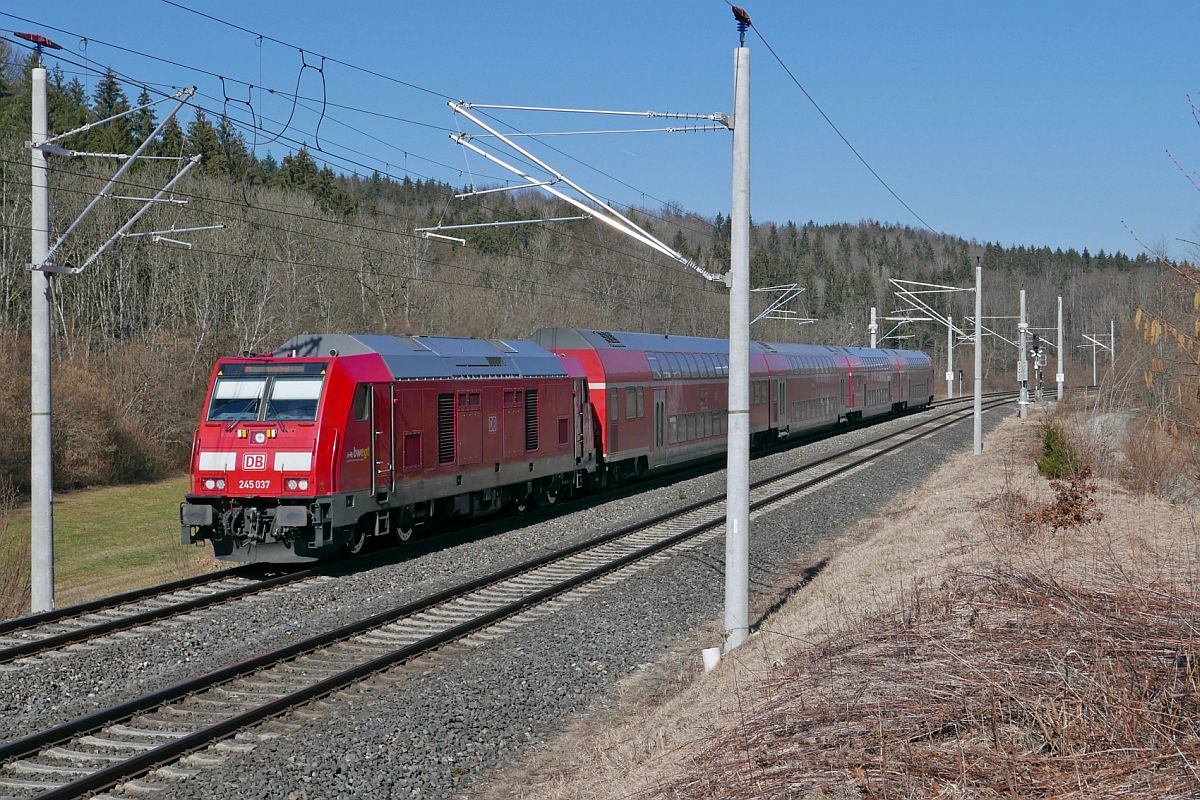 Zwischen Aulendorf und Mochenwangen zieht 245 037 am 01.03.2021 die Wagen des RE 5 / RE 4213, Stuttgart - Friedrichshafen, durch den Schussentobel bei Kilometer 163.8 Jürgen Vos
