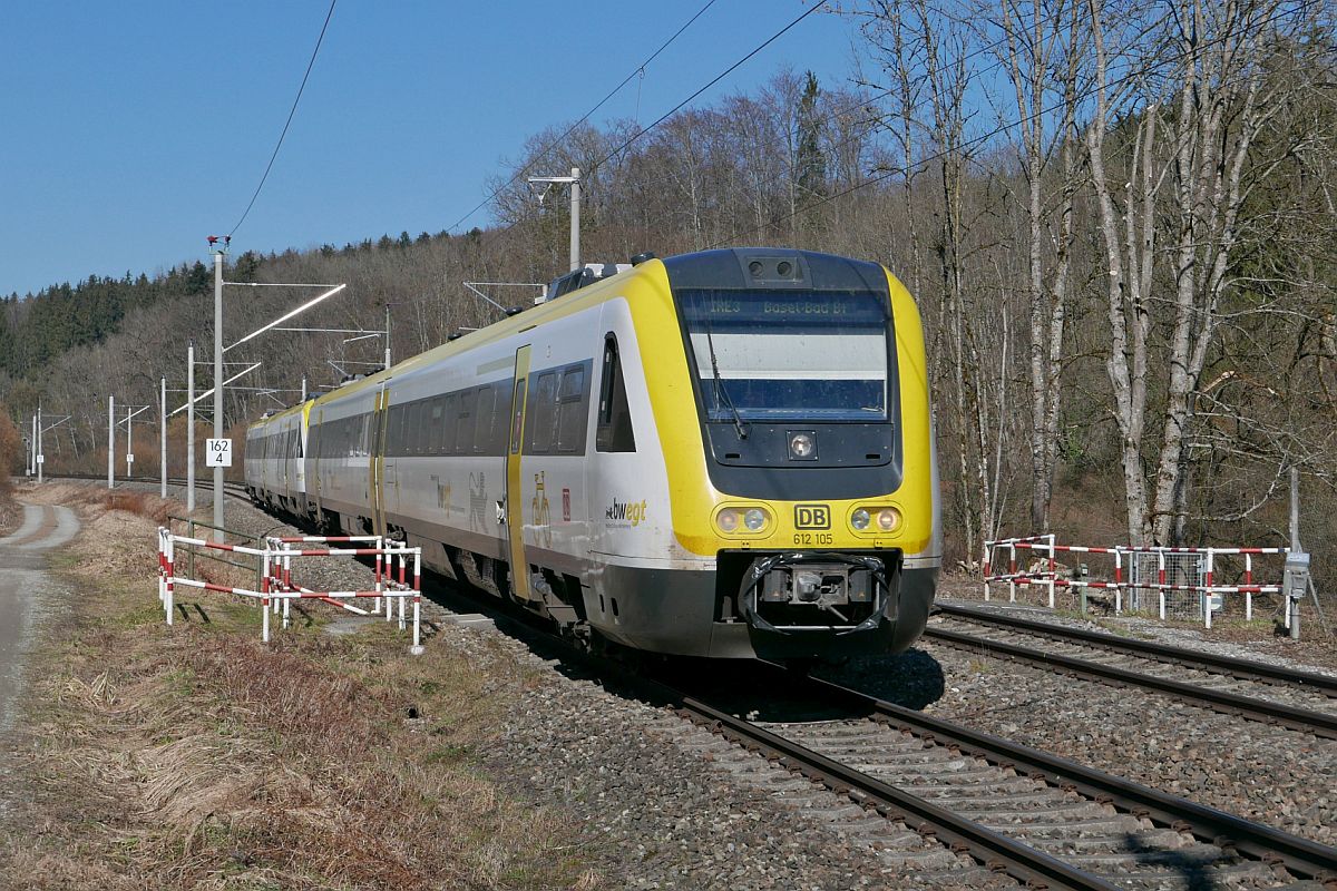 612 105 und ein unerkannt gebliebener Triebwagen fahren am 01.03.2021 von Ulm kommend als IRE 3 / IRE 3046 zwischen Aulendorf und Mochenwangen, im Schussentobel bei Kilometer 162.4, nach Basel Bad Bf. Jürgen Vos