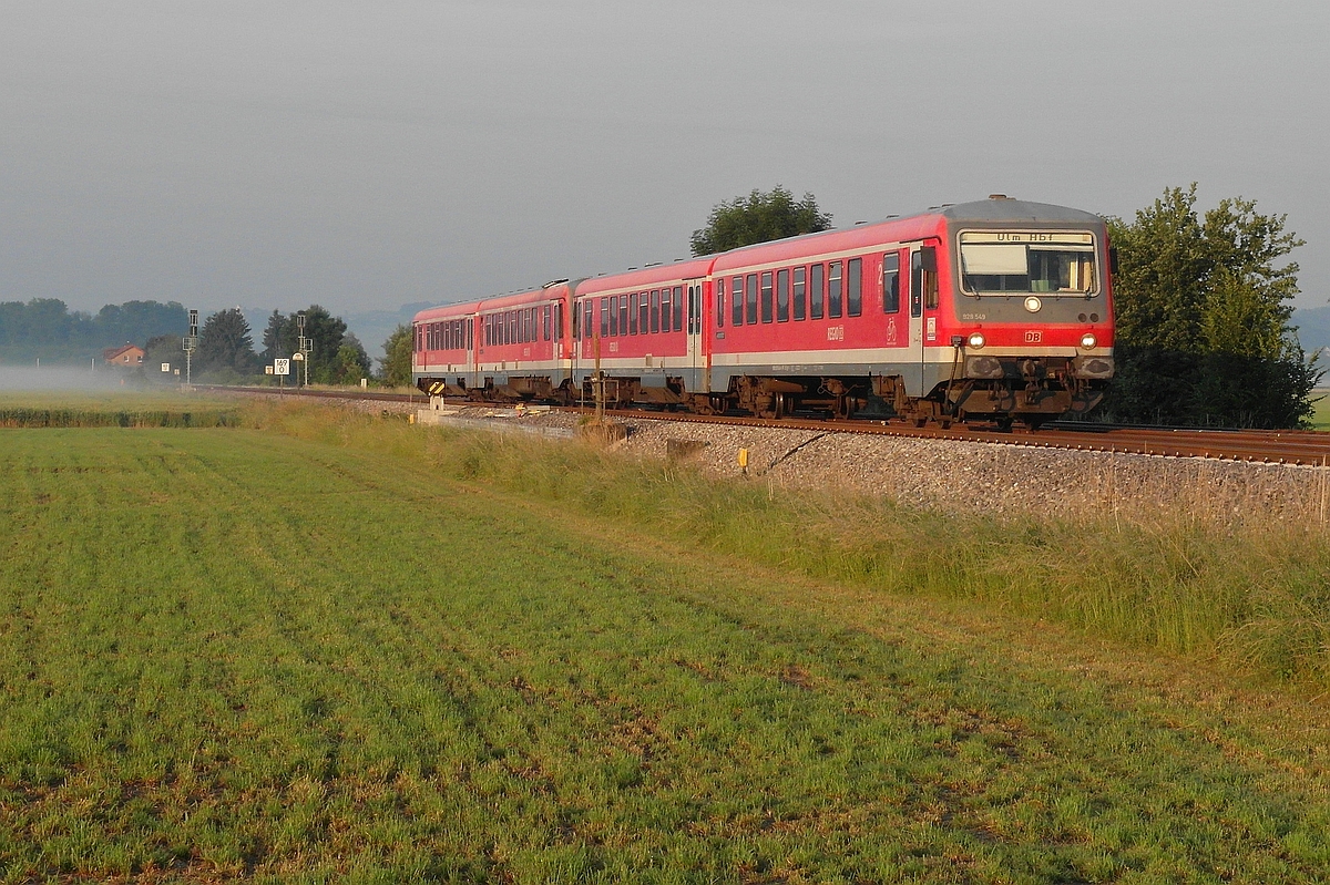 Kurz vor Mochenwangen fahren die in Friedrichshafen gestarteten 928/628 549 und ein weiterer Triebwagen der Baureihe 628 am 22.06.2017 als RE 22606 nach Ulm. Jürgen Vos