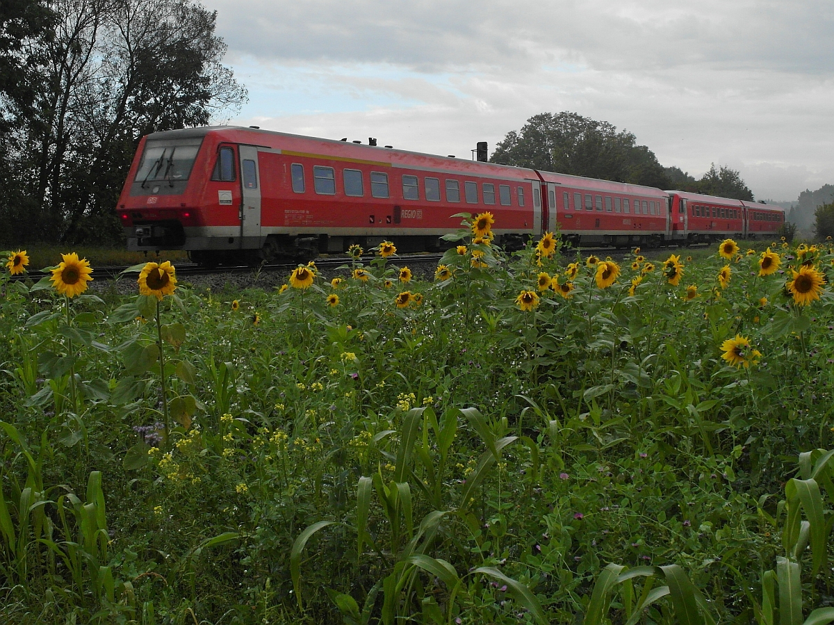 225 803-6 und 225 809-3 haben den von Maschen kommenden Containerzug in Ulm übernommen und ziehen diesen am 11.09.2014 zwischen Mochenwangen und Niederbiegen nach Lindau-Reutin. Dort wird der Zug von einer ÖBB-Lok übernommen und zum Zielbahnhof in Wolfurt gezogen. Jürgen Vos