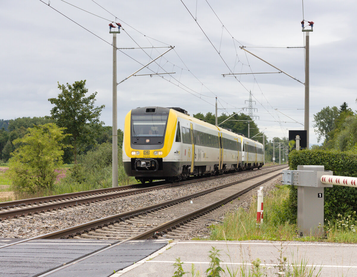 213 339 am Zugschluss eines Bauzugs weiter bestehend aus Stopfmaschine und 215 101 an der Spitze am 08.08.2021 bei Ravensburg in Richtung Süden fahrend. Fluffy