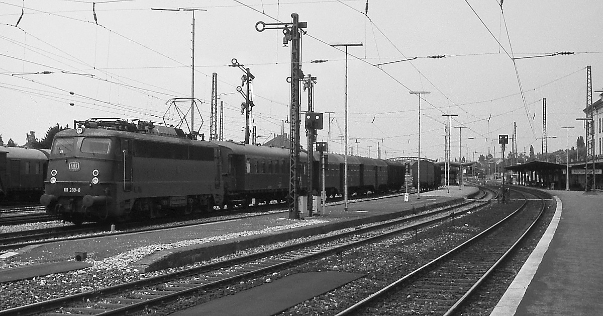 Die 110 288-8 war die erste E 10-Serienlok mit "Bügelfalte". Im Mai 1978 verlässt sie mit einem damals typischen Zug, bestehend aus einem Vorkriegs-Eilzugwagen, zwei Umbau-Vierachsern und einem Güterwagen den Reutlinger Hauptbahnhof. Horst Lüdicke