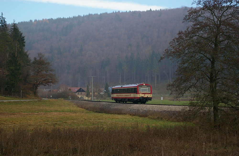 Am 21. November 2012 war es Mittags im Laucherttal schon etwas duster, trotzdem habe ich mich noch an die Strecke gestellt. VT 41 hat vor kurzem Hettingen verlassen und fährt seinem Ziel Sigmaringen entgegen. Friederich Rieber