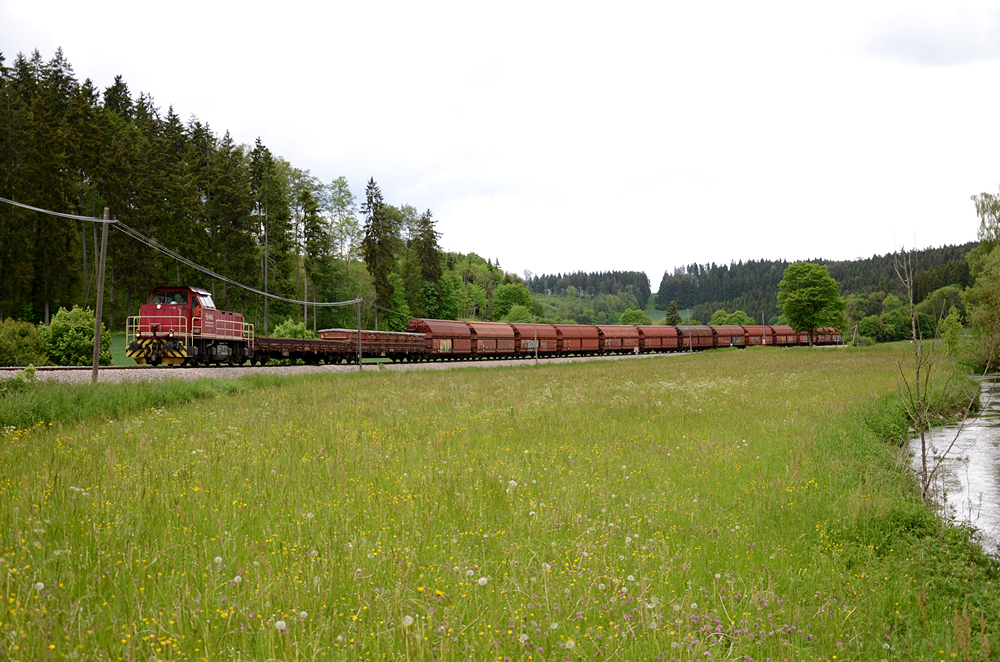 Der Salzug der HzL am 28. Mai 2014 im Laucherttal. Gezogen von V 150 hat er Gammertingen verlassen und wird gleich Hettingen erreichen. Seine Fahrt geht weiter nach Ulm. Friederich Rieber
