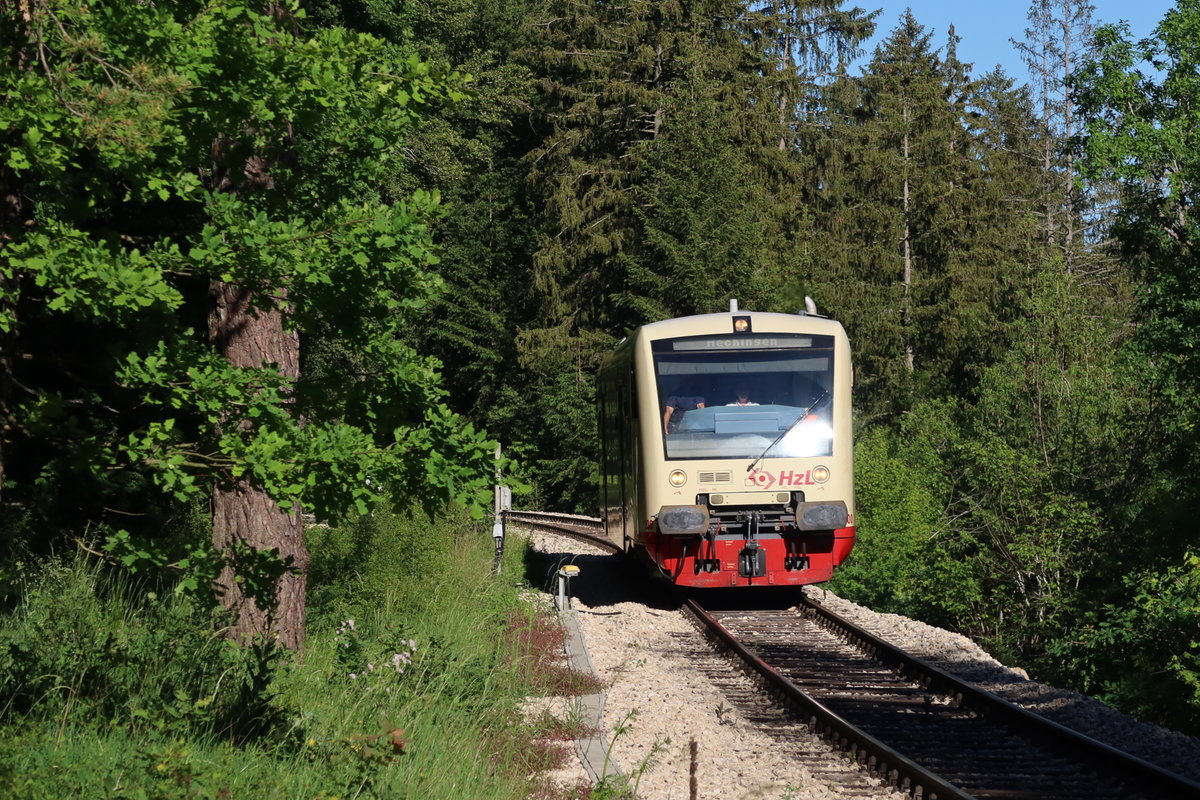 Zug 86341 der Hohenzollerischen Landesbahn HZL erreicht am 12. Juni 2020 um 18:46 Uhr von Hechingen kommend den Scheiteltunnel an der Gammertinger Fehlakapelle und wird den Bahnhof Gammertingen planmäßig erreichen. Das Triebfahrzeug ist der RegioShuttle RS1 mit der Nummer 215.