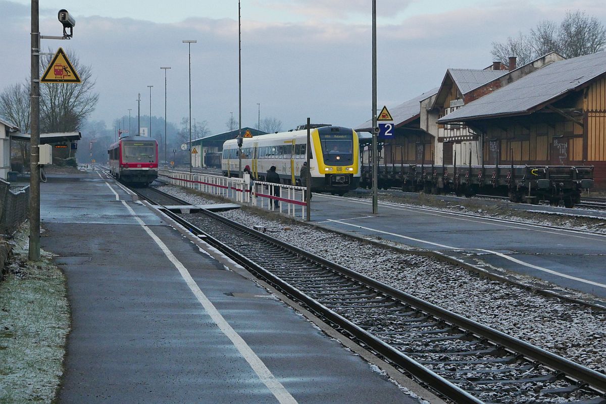Im württembergischen Bahnhof Mengen muss die "Biberbahn" rasch wieder Platz machen für den Verkehr auf der Donautalbahn, ein dritter Bahnsteig ist nur noch rudimentär vorhanden, vorne 650 382 vom Ringzug, hinten das Seehäsle 650 627.
