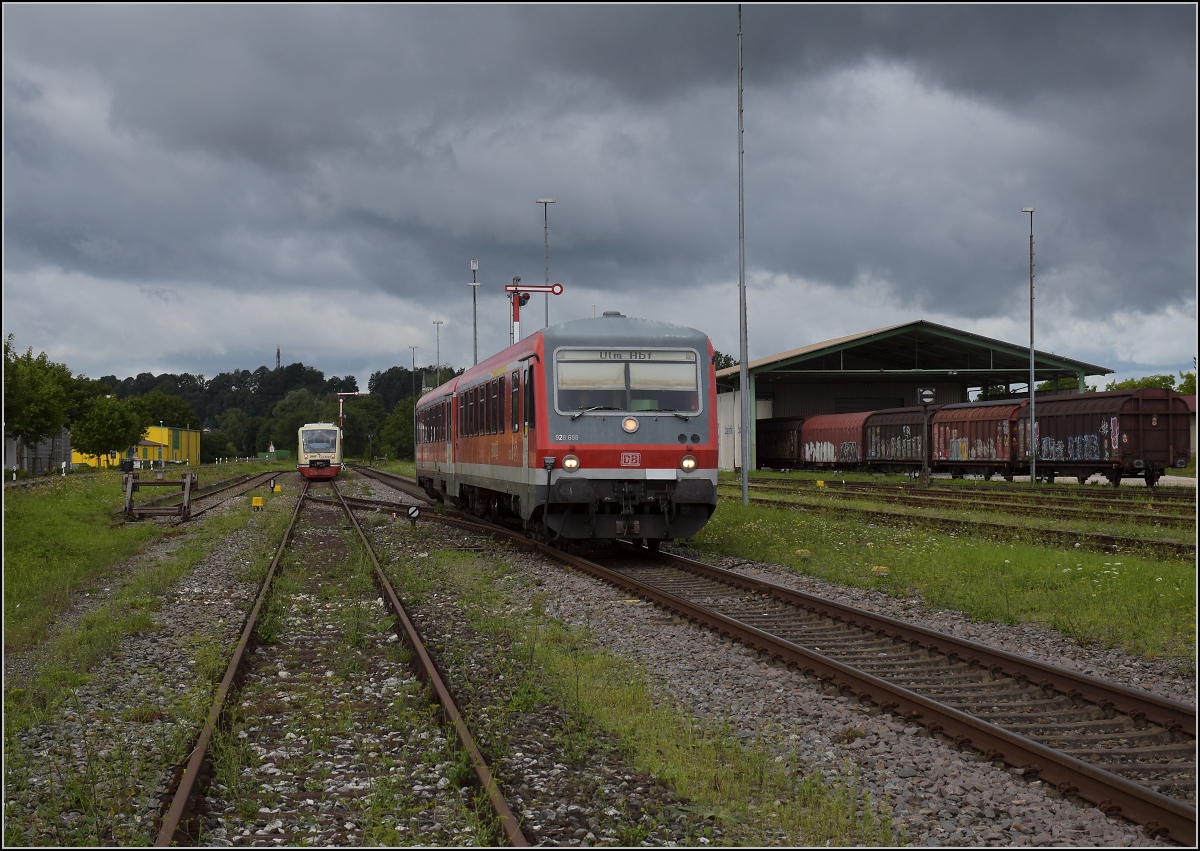 Im württembergischen Bahnhof Mengen muss die "Biberbahn" rasch wieder Platz machen für 628/928 698 auf der Donautalbahn, ein dritter Bahnsteig ist nur noch rudimentär vorhanden, vorne 650 382 vom Ringzug, hinten das Seehäsle 650 627. Gut zu erkennen, dass hier überraschend viel Nahgüterverkehr stattfindet.