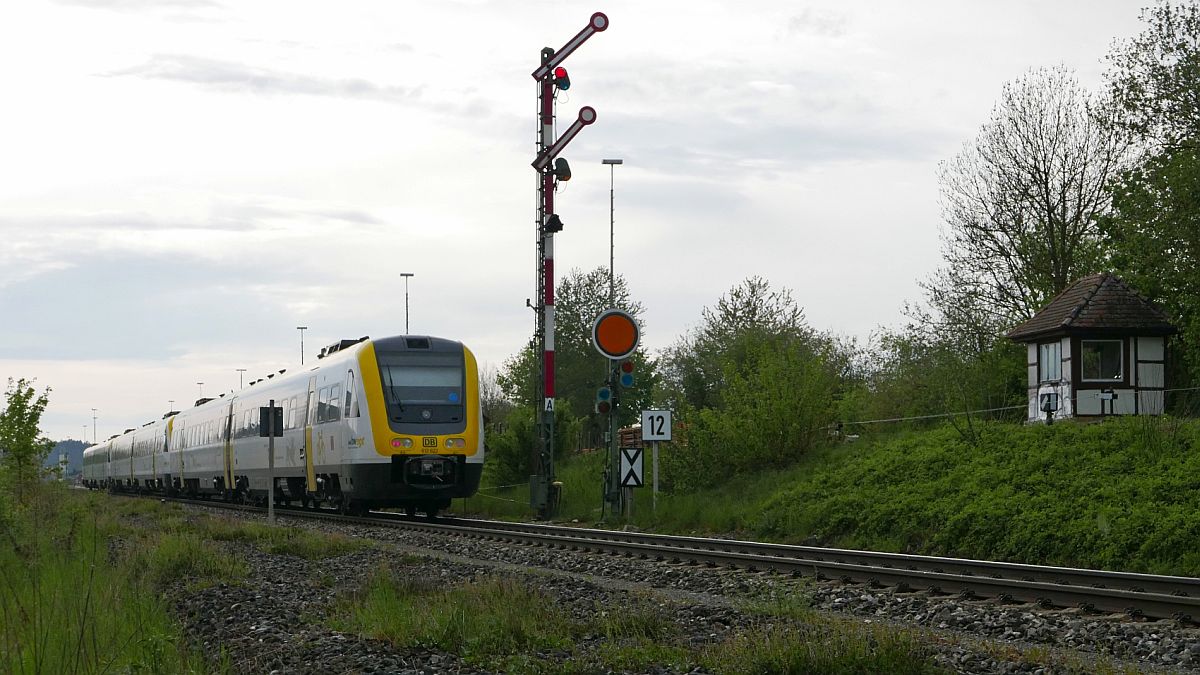 Mit 612 622 am Zugende und zwei weiteren Triebwagen dieser Baureihe fährt IRE 3266, Aulendorf - Stuttgart, bei leichtem Regen am 02.05.2019 mit 11 Minuten Verspätung am Einfahrsignal von Mengen vorbei. Jürgen Vos