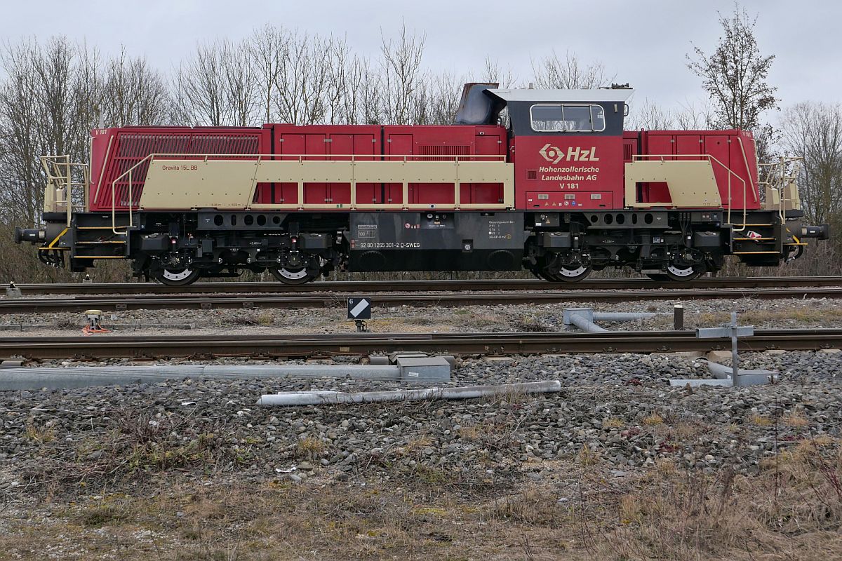 Während 650 017 auf die Weiterfahrt nach Sigmaringen wartet, rangiert V181 / 265 301-2 der HzL / SWEG Rungenwagen im Bahnhof von Mengen (08.02.2021) Jürgen Vos